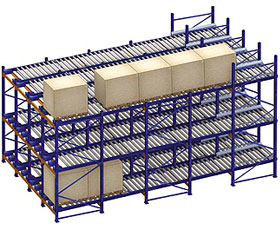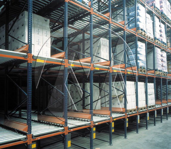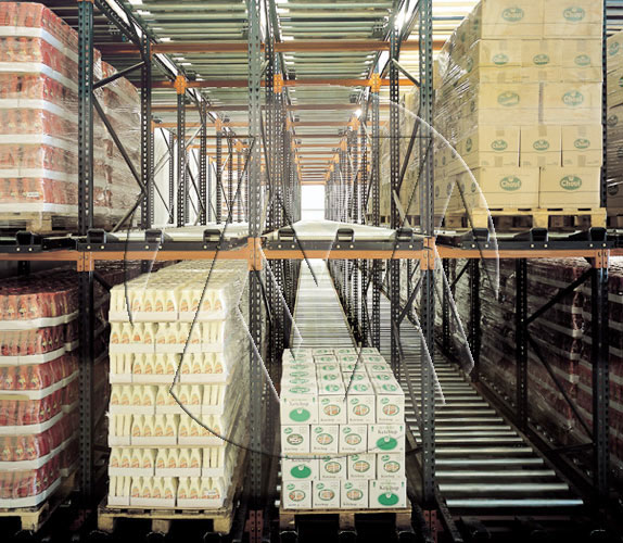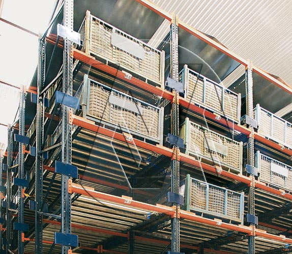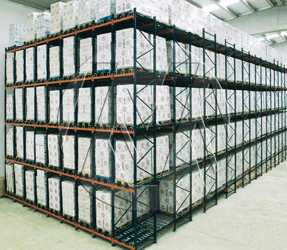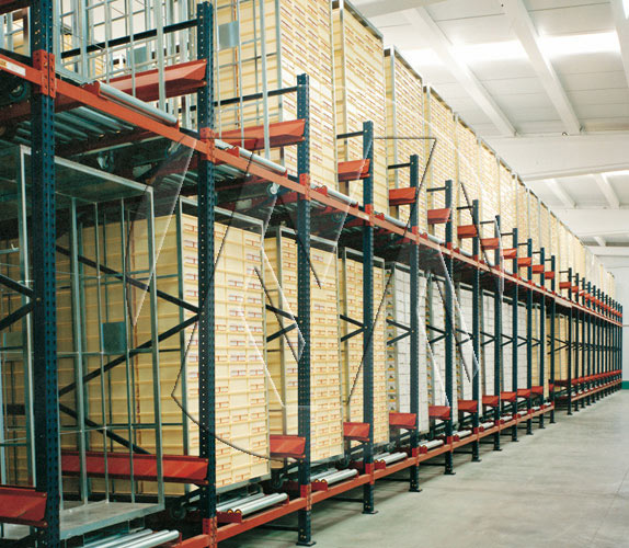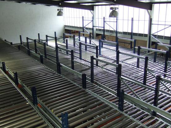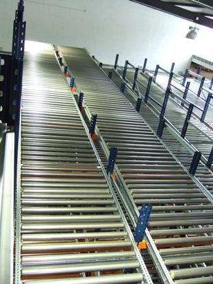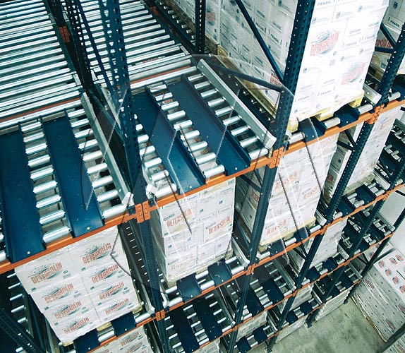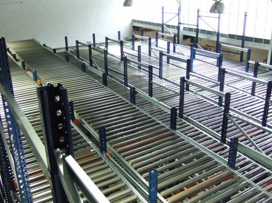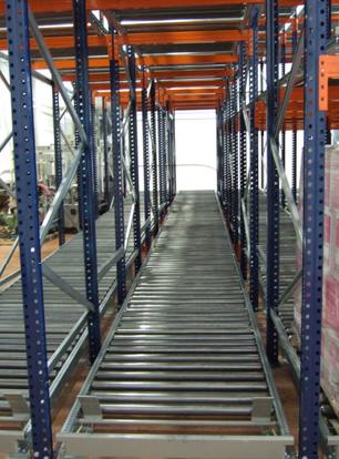 Las estanterías incorporan caminos de rodillos con una ligera pendiente que permite el deslizamiento de las paletas, por gravedad y a velocidad controlada, hasta el extremo contrario.