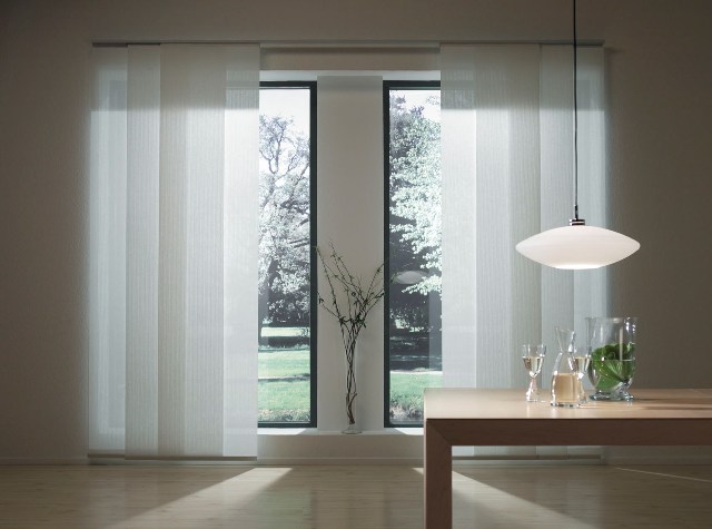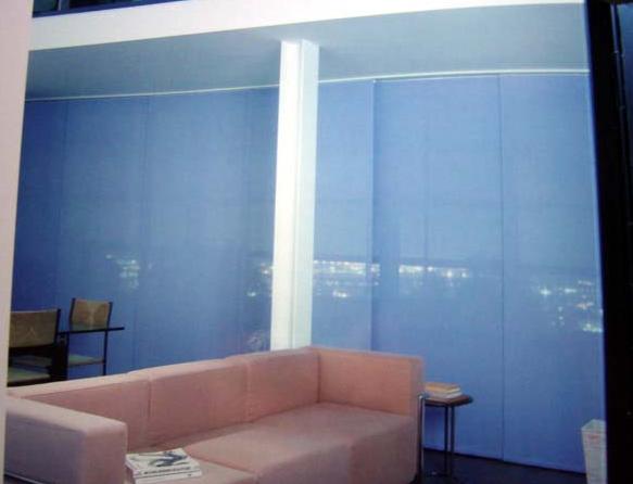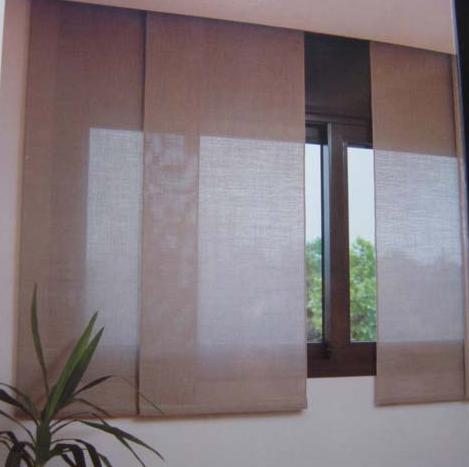 - Sistema de cortina para interiores con recogida para desplazamiento horizontal sucesivo de paneles textiles.