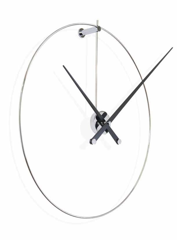 Materiales: acero y nogal lacado. Acabados: agujas lacadas (rojo. negro o blanco mate). Medidas: 105 cms. diámetro. Maquinaria: de cuarzo UTS (alemana).
