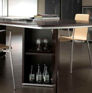 Componentes disponibles en seis acabados diferentes: dos en chapa de madera barnizada (cerezo y haya) y cuatro en estratificado (zebrano, wengué, nogal y roble), siempre combinados con gris aluminio.